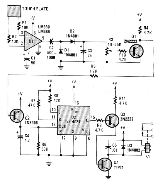 Este circuito fue publicado en una Popular Electronics de febrero de 1991. La revista ya no existe, pero el circuito es actual, ya que todos los componentes se pueden encontrar con facilidad. Se trata de una sofisticada clave de toque biestable que acciona un relé, El circuito puede ser alimentado por tensiones de 6 a 12 V conforme al relé. Nunca alimente este tipo de circuito con fuente sin transformador. Q2 puede ser un BC548.