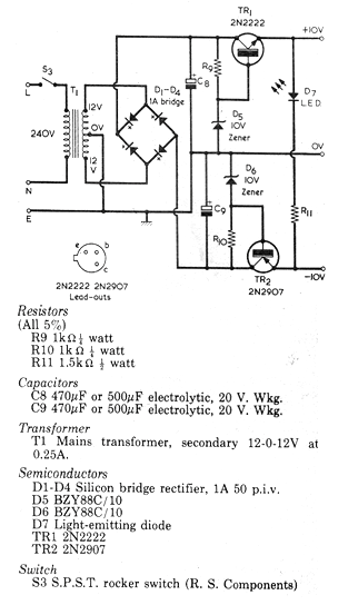 He encontrado este interesante circuito en una Radio & Electronics Constructor de marzo de 1976. El circuito es actual, bastando usar para el transistor NPN un BD135 y para el PNP un BD136. El zener determina la tensión de salida que puede cambiar. El transformador de 12 + 12 V tiene corriente de 250 a 500 mA. Los transistores deben montarse en radiadores de calor. Los diodos del puente pueden ser los 1N4002 o 1N4004. El indicador LED es opcional. En realidad la tensión de salida es un poco menos de 10 V pues, debemos considerar la caída de tensión en la junción emisor-base emisora de los transistores.
