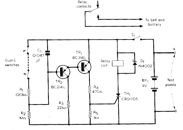 El circuito presentado fue encontrado en una Radio & Electronics Constructor de 1976. La revista ya no existe, pero basta cambiar los transistores por BC558 y usar un TIC106 como SCR que el circuito se vuelve viable. Utilice un relé de 6 V para alimentación de 9 V para compensar la caída de 2 V en el SCR. El consumo en reposo es muy bajo y se pueden utilizar muchos sensores. El consumo en espera de esta alarma es del orden de 12 uA.