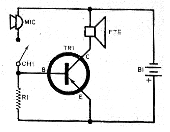 Este circuito es de 1964, pero todavía se puede montar si los componentes principales se encuentran o se reemplazan adecuadamente. Para el transistor podemos usar el TIP42. El micrófono, sin embargo, debe ser obligatoriamente de carbón. La alimentación puede ser hecha por 4 o 6 pilas grandes y R1 debe ser de 10 a 47 ohms x 5 W. El mejor valor debe ser obtenido experimentalmente. S1 es un interruptor de presión que será apretado para hablar. Para mayor rendimiento, el altavoz debe ser del tipo "bocina".