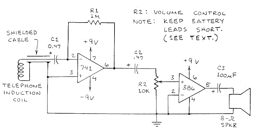 Este circuito, bastante actual utiliza una bobina (maricota) para captar las señales de un teléfono y aplicarlos a un amplificador para que todos escuche. El circuito fue publicado en una Modern Electronics de febrero de 1991. La revista ya no existe pero el circuito puede montarse con facilidad, bastando con el enrollamiento primario de un transformador cualquiera de 110 V o 220 V como bobina captadora. Para ello, retiramos su núcleo y aprovechamos sólo el carrete. También recomendamos utilizar dos conjuntos de 4 pilas en la alimentación, que rinden más de dos baterías de 9 V. Utilice cable blindado para el captador y utilice cables cortos para conectar las pilas o la batería.