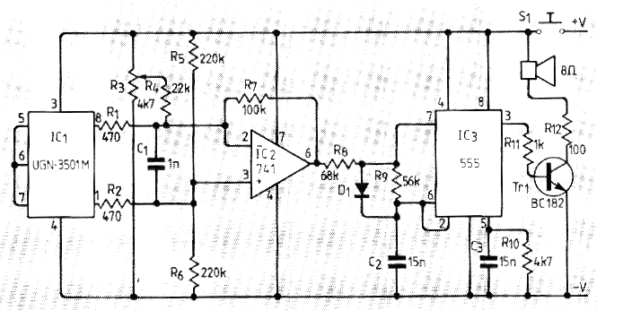 El sensor HALL de este circuito encontrado en un Wireless World de marzo de 1990 no es muy fácil de obtener, pero si el montador tiene la suerte. Lo que este circuito hace es emitir un tono que depende de la orientación del sensor en relación al campo magnético. Se trata de un dispositivo recomendado para ayudar a los discapacitados visuales. El circuito se alimenta con una batería de 9 V,