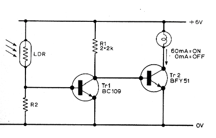 Este circuito fue publicado originalmente en una Practical Wireless de noviembre de 1977. La revista ya no existe pero el circuito se puede montar utilizando uno, BC549 en lugar del BC109 y un BD135 en lugar del BFY51. Lo que el circuito hace es encender una lámpara indicadora cuando incide la luz en el LDR. R2 depende de la intensidad de la luz que se detectará entre 10k y 100k típicamente.