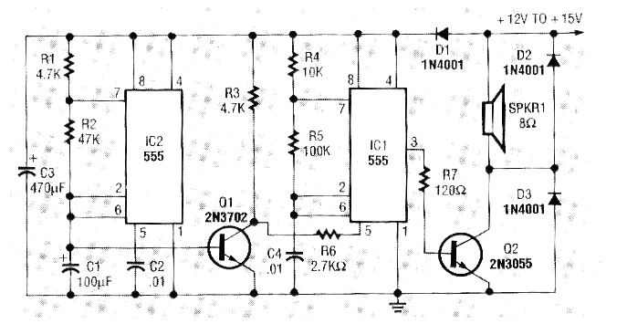 Este circuito, muy conocido de los lectores y bien explorado en nuestro artículo "El Circuito Integrado 555" (ART804S), fue encontrado en una Radio Electronics de octubre de 1992. La revista ya no existe, pero el circuito es actual. Vea más en nuestro ART804S y en la sección de matemáticas como hacer cálculos para los componentes de este circuito. En este circuito, una señal intermitente se reproduce en el altavoz imitando una. La frecuencia central está determinada por R4, R5 y C4. La modulación es dada por R1, R2 y C1. También podemos añadir en la etapa de potencia un BD135 o TIP31 como se muestra en el ART804S para obtener mucho sonido más intenso. Este circuito se puede utilizar en las alarmas. Q1 puede ser el BC548.