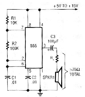 Este circuito, muy conocido de los lectores y bien explorado en nuestro artículo "El Circuito Integrado 555" (ART804S), fue encontrado en una Radio Electronics de octubre de 1992. La revista ya no existe, pero el circuito es actual. Vea más en nuestro ART804 y en la sección de matemáticas como hacer cálculos para los componentes de este circuito. También tenemos su simulación en la sección de circuitos simulados. En este circuito se reproduce una señal de 800 Hz en el altavoz. La frecuencia central está determinada por R1, R2 y C1. Podemos añadir una etapa de potencia con un BD135 o TIP31 como se muestra en el ART011 para obtener mucho sonido mucho más intenso. Este circuito se puede utilizar en las alarmas (véase también CIR8912S).