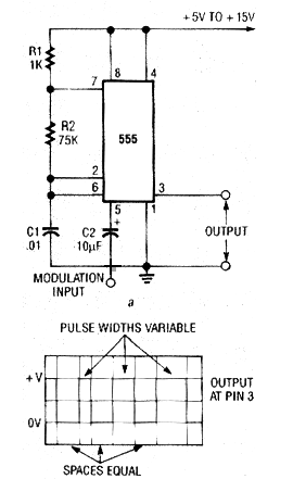 Este circuito, muy conocido de los lectores y bien explorado en nuestro artículo "El Circuito Integrado 555" (ART804S), fue encontrado en una Radio Electronics de octubre de 1992. La revista ya no existe, pero el circuito es actual. Vea más en nuestro ART804 y en la sección de matemáticas como hacer cálculos para los componentes de este circuito. También tenemos su simulación en la sección de circuitos simulados. En este circuito cuando aplicamos una señal en la entrada la frecuencia es modulada, con la variación de la anchura de la muñeca. La frecuencia central está determinada por R1, R2 y C1.