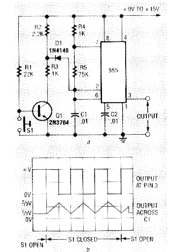 Este circuito, muy conocido de los lectores y bien explorado en nuestro artículo "El Circuito Integrado 555" (ART804S), fue encontrado en una Radio Electronics de octubre de 1992. La revista ya no existe, pero el circuito es actual. Vea más en nuestro ART804S y en la sección de matemáticas como hacer cálculos para los componentes de este circuito. También tenemos su simulación en la sección de circuitos simulados. En este circuito cuando presionamos la llave de arranque el oscilador produce una señal cuya frecuencia es determinada por R4, R5 y C1. S1 puede ser un sensor. El transistor puede ser el BC548. Ver la forma de onda triangular en C1 dada por la carga y descarga constantes de este componente.