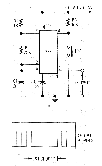 Este circuito, muy conocido de los lectores y bien explorado en nuestro artículo "El Circuito Integrado 555" (ART804S), fue encontrado en una Radio Electronics de octubre de 1992. La revista ya no existe, pero el circuito es actual. Vea más en nuestro ART804S y en la sección de matemáticas como hacer cálculos para los componentes de este circuito. También tenemos su simulación en la sección de circuitos simulados. En este circuito cuando presionamos la llave de arranque el oscilador produce una señal cuya frecuencia es determinada por R1, R2 y C1. S1 puede ser un sensor.
