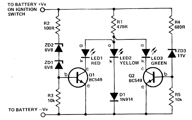He encontrado este circuito en un artículo de la revista Electronics Today International de julio de 1979. Se trata de una configuración que puede ser elaborada en diversas configuraciones similares, muchas de las cuales ya exploramos en nuestros artículos. Esta configuración tiene tres LED que se encienden según la carga de una batería de q12 V. El circuito es muy simple y todos los componentes son actuales. El LED rojo se enciende con tensiones por debajo de 11,6 V indicando la falta de carga. Con tensiones entre 11,7 y 4,2 V enciende el verde, indicando la carga normal y con tensiones por encima de 14,2 V tenemos el LED rojo encendiendo indicando sobrecarga, lo que puede indicar problemas con el regulador de tensión del vehículo.