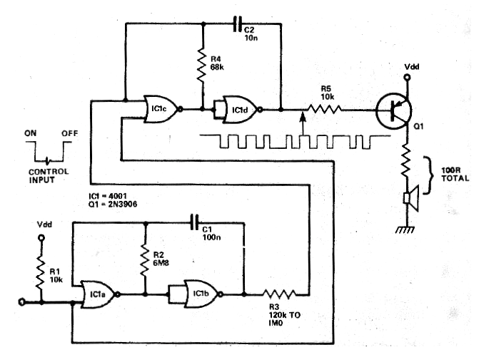He encontrado este circuito de shield en un artículo de la revista Electronics Today International de julio de 1979. Se trata de una configuración de astable utilizando dos puertas de un circuito integrado 4011 que dispara un oscilador hecho con otras dos tres puertas de circuitos integrados del mismo tipo. El circuito emite un sonido modulado de sirena durante el tiempo en que la entrada permanece en el nivel bajo. El transistor puede ser el BD136 y con este componente, se puede conectar directamente un altavoz de 8 ohms. Para un BC558, se recomienda una salida con impedancia mayor, en el caso, un total de 100 ohms que da el valor del resistor conectado en serie con el altavoz. Vea en la sección de descargas cursos Curso de Electrónica Digital más sobre este tipo de circuito. En la sección de matemáticas para electrónica tenemos las fórmulas para calcular la frecuencia de este circuito. La alimentación se puede realizar por tensiones de 5 a 15 V.