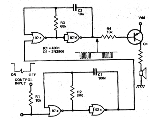 He encontrado este circuito de shield en un artículo de la revista Electronics Today International de julio de 1979. Se trata de una configuración de biestable utilizando dos puertas de un circuito integrado 4001 que dispara un oscilador hecho con las otras dos puertas del mismo circuito integrado. El circuito emite un sonido intermitente durante el tiempo en que la entrada permanece en el nivel bajo. El transistor puede ser el BD136 y con este componente, se puede conectar directamente un altavoz de 8 ohms. Para un BC558, se recomienda una salida con impedancia mayor, en el caso, un total de 100 ohms que da el valor del resistor conectado en serie con el altavoz. Vea en la sección de descargas cursos Curso de Electrónica Digital más sobre este tipo de circuito. En la sección de matemáticas para electrónica tenemos las fórmulas para calcular la frecuencia de este circuito. La alimentación se puede realizar por tensiones de 5 a 15 V.