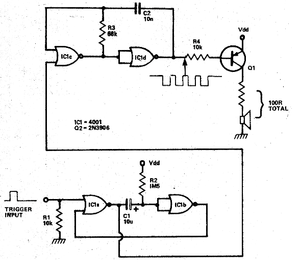 He encontrado este circuito en un artículo de la revista Electronics Today International de julio de 1979. Se trata de una configuración de monoestable utilizando dos puertas de un circuito integrado 4001 que dispara un oscilador hecho con las otras dos puertas del mismo circuito integrado. El circuito emite sonido durante 10 segundos aproximadamente y luego se apaga. El transistor puede ser el BD136 y con este componente, se puede conectar directamente un altavoz de 8 ohms. Para un BC558, se recomienda una salida con impedancia mayor, en el caso, un total de 100 ohms. Vea en la sección de descargas cursos Curso de Electrónica Digital más sobre este tipo de circuito. En la sección de matemáticas para electrónica tenemos las fórmulas para calcular la frecuencia de este circuito. La alimentación se puede realizar por tensiones de 5 a 15 V.
