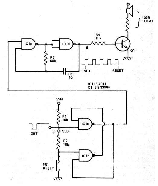 He encontrado este circuito en un artículo de la revista Electronics Today International de julio de 1979. Se trata de una configuración de biestable utilizando dos puertas de un circuito integrado 4011 que dispara un oscilador hecho con las otras dos puertas del mismo circuito integrado. El transistor puede ser el BD135 y con este componente, se puede conectar directamente un altavoz de 8 ohmios. Para un BC548, se recomienda una salida con impedancia mayor, en el caso, un total de 100 ohmios. Vea en la sección de descargas cursos Curso de Electrónica Digital más sobre este tipo de circuito. En la sección de matemáticas para electrónica tenemos las fórmulas para calcular la frecuencia de este circuito. La alimentación se puede realizar por tensiones de 5 a 15 V.