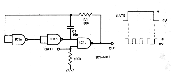He encontrado este circuito de shield en un artículo de la revista Electronics Today International de julio de 1979. Se trata de una configuración de astable utilizando dos puertas de un circuito integrado 4011. En este circuito el disparo es hecho por el nivel alto en la entrada. Vea en la sección de descargas cursos Curso de Electrónica Digital más sobre este tipo de circuito. En la sección de circuitos simulados también tenemos esta configuración en operación. Finalmente, en la sección de matemáticas para electrónica tenemos las fórmulas para calcular la frecuencia de este circuito. La alimentación se puede realizar por tensiones de 5 a 15 V.