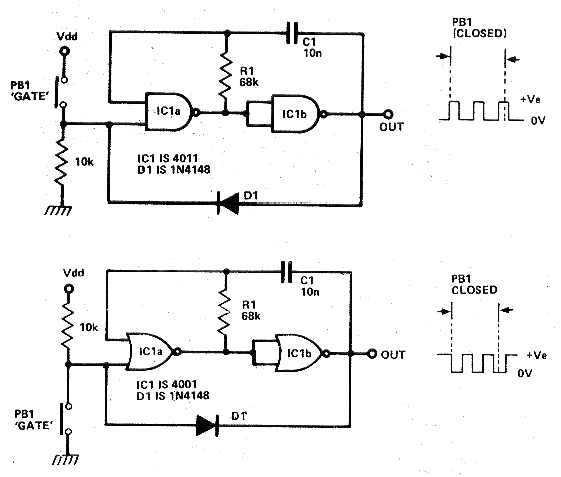 He encontrado estos circuitos de shield en un artículo número de la revista Electronics Today International de julio de 1979. Se trata de configuraciones de asequible utilizando dos puertas de un circuito integrado 4001 o 4011. Sus entradas se unen para que funcionen como inversores. En este circuito el disparo es hecho por el nivel alto o bajo en la entrada dado por un interruptor de presión o sensor. Vea en la sección de descargas cursos Curso de Electrónica Digital más sobre este tipo de circuito. En la sección de circuitos simulados también tenemos esta configuración en operación. Finalmente, en la sección de matemáticas para electrónica tenemos las fórmulas para calcular la frecuencia de este circuito. La alimentación se puede realizar por tensiones de 5 a 15 V.