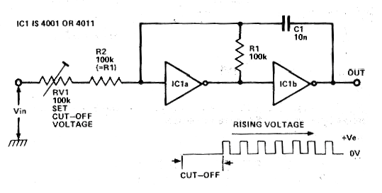 He encontrado este circuito en un artículo de la revista Electronics Today International de julio de 1979. Se trata de una configuración de astable utilizando dos puertas de un circuito integrado 4001 o 4011. Vea que para usar puertos NOR o NAND como inversores basta unir las entradas. En este circuito la modulación es hecha por una tensión de control Vin. En la sección de descargas simuladas también tenemos esta configuración en funcionamiento. Finalmente, en la sección de matemáticas para electrónica tenemos las fórmulas para calcular la frecuencia de este circuito. La alimentación se puede realizar por tensiones de 5 a 15 V.