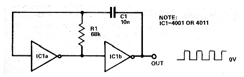 He encontrado este circuito en un artículo de la revista Electronics Today International de julio de 1979. Se trata de una configuración de astable utilizando dos puertas de un circuito integrado 4001 o 4011. Vea que para usar puertos NOR o NAND como inversores basta unir las entradas. En la sección de descargas cursos Curso de Electrónica Digital más sobre este tipo de circuito. La alimentación puede ser hecha por tensiones de 5 a 15 V.