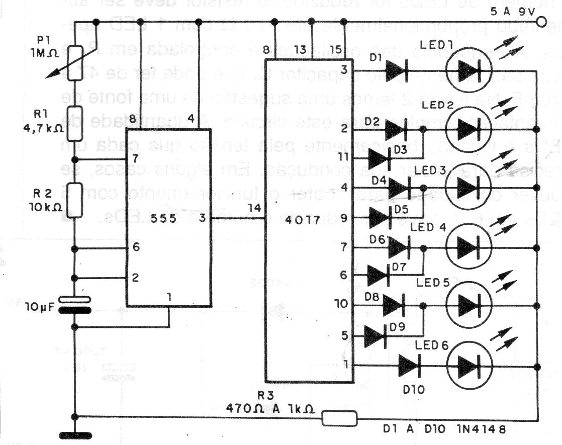 Este circuito de efecto de LED se ha encontrado en una documentación de 1995. Acciona 6 LEDs secuencialmente, mientras que los extremos se encienden por menos tiempo. El circuito puede ser alimentado por tensiones de 6 a 9 V y la velocidad se controla en P1.