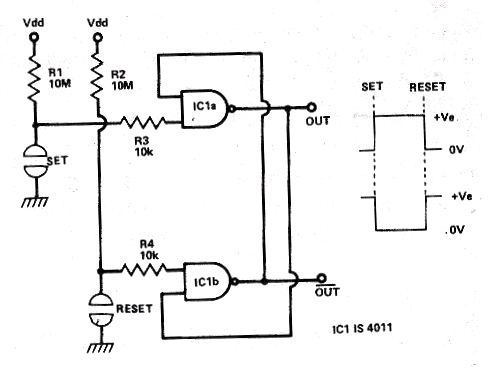 He encontrado este circuito en un artículo de la revista Electronics Today International de julio de 1979. Se trata de una configuración de biestable utilizando dos puertos NOR de un circuito integrado 4011. Vea en la sección de descargas cursos Curso de Electrónica Digital más sobre este tipo de circuito. La señal de set y reset consisten en pulsos positivos con la tensión de alimentación producidos por dos sensores de tacto. La alimentación puede realizarse por tensiones de 5 a 15 V. Nunca utilice fuente sin transformador en este tipo de circuito.