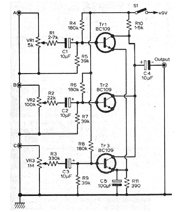 Este circuito salió en una práctica inalámbrica de noviembre de 1975. La revista ya no existe, pero basta con cambiar los transistores BC109 por los actuales BC549 y el proyecto se vuelve viable. La alimentación se puede realizar con una batería de 9 V, ya que el consumo es muy bajo. Si se utiliza la fuente debe tener un excelente filtrado, por lo que no se producen ronquidos. Los canales poseen impedancias de entrada diferentes y VR1 puede ser de 4k7 que es el valor comercial actual más fácilmente encontrado en los proveedores. Los cables de entrada y de salida de las señales deben ser blindados.