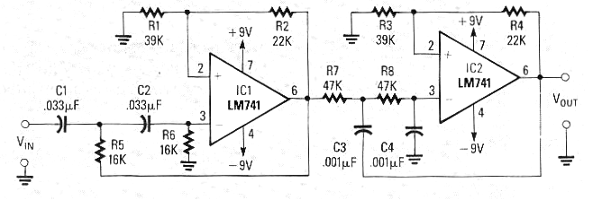 Este circuito salió en la Radio Electronics de más de 1989. La revista ya no existe, pero el circuito es actual. Este circuito deja pasar las señales en la banda de voz de 300 a 3,4 kHz (banda telefónica) con una respuesta de segundo orden, teniendo una entrada de baja impedancia. La fuente de alimentación debe ser simétrica de 5 a 12 V y la fórmula para calcular los componentes utilizados en función de la frecuencia está junto al diagrama. Vea más sobre el cálculo de este tipo de circuito en la sección de matemáticas del sitio.