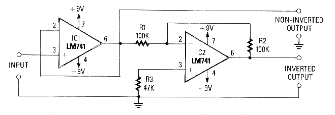 Este circuito salió en la Radio Electronics de más de 1989. La revista ya no existe, pero el circuito es actual. Este circuito proporciona señales con fases opuestas en relación a la señal aplicada a la entrada. Las dos señales tienen la misma amplitud y la ganancia de la segunda etapa, así como la primera es unitaria. La fuente debe ser simétrica de 5 a 12 V y la entrada es para señales de alta impedancia. Vea más sobre este circuito en la sección de matemáticas del sitio.
