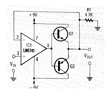 Este circuito salió en la Radio Electronics de más de 1989. La revista ya no existe, pero el circuito es actual. En este circuito tenemos un reforzador de salida con una ganancia unitaria para el 741. La fuente debe ser simétrica de 5 a 12 V y la entrada es para señales DC en una configuración no inversora. Ver más sobre este circuito en la sección de matemáticas del sitio. El transistor NPN puede ser el BC548 o BD135 y el PNP el BC558 o BD136, dependiendo de la corriente deseada en la carga.