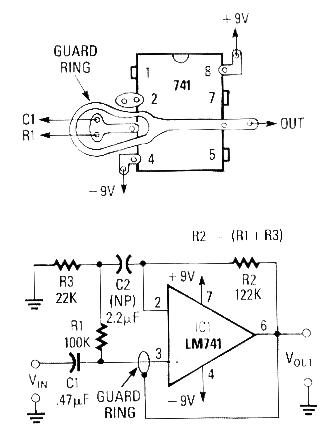 Este circuito salió en la Radio Electrónica de más de 1989. La revista ya no existe, pero el circuito es actual, mostrando cómo obtener ajuste de offset en un seguidor de tensión (ganancia unitaria) con un 741 para operación AC. Este circuito tiene una ganancia unitaria con una alta impedancia de entrada y una baja impedancia de salida. La fuente debe ser simétrica y la tensión puede variar entre 5 y 12 V. El anillo de guarda (Guard Ring) es muy importante para evitar problemas de captación de ruidos e inestabilidades en este circuito que tiene una impedancia de entrada muy alta. Se trata de un anillo hecho en la propia placa aislando la pista de señal de la entrada del operario. Ver más sobre los cálculos de este tipo de circuito en la sección de Matemáticas para la electrónica del sitio. El amplificador es del tipo no inversor.