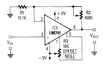 Este circuito salió en la Radio Electrónica de más de 1989. La revista ya no existe, pero el circuito es actual, mostrando cómo obtener ganancia 10 de un 741. La fuente debe ser simétrica y la tensión puede variar entre 5 y 12 V. La ganancia se ajusta en R2 que varía la resistencia en el circuito de realimentación. En este caso tenemos una ganancia de tensión ajustable entre 1 y 10. Con un potenciómetro de 1 M podemos ajustar la ganancia entre 1 y 100. Vea más sobre los cálculos de este tipo de circuito en la sección de Matemáticas Para Electrónica del sitio.
