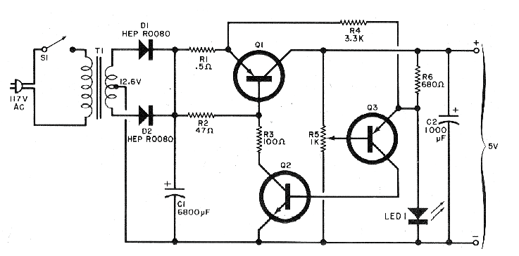 Este circuito salió en el Electronic Experimenter Handbook de 1980, una publicación de la Popular Electronics que ya no existe. El circuito se puede montar fácilmente cambiando los transistores y los diodos por tipos actuales. Así, para los diodos tenemos el 1N4002. Para Q1 se puede utilizar el TIP32 en disipador, y para Q2 el BC548. Para Q3 se puede utilizar el BC558. El transformador tiene un secundario de 1 A con 12 V.