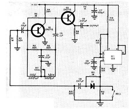 Este circuito salió en el Electronic Experimenter Handbook de 1980, una publicación de la Popular Electronics que ya no existe. El circuito muestra cómo elaborar un simple circuito generador del sonido de silbido de locomotora. La señal se debe aplicar a la entrada de un amplificador de audio. La alimentación debe ser hecha con fuente de 15 V, pero el consumo es bajo, del orden de algunas decenas de miliampères. El ajuste de la velocidad del efecto y, por lo tanto, de la locomotora se ajusta en R3. Los transistores admiten equivalentes. Para los transistores se pueden utilizar los BC548.