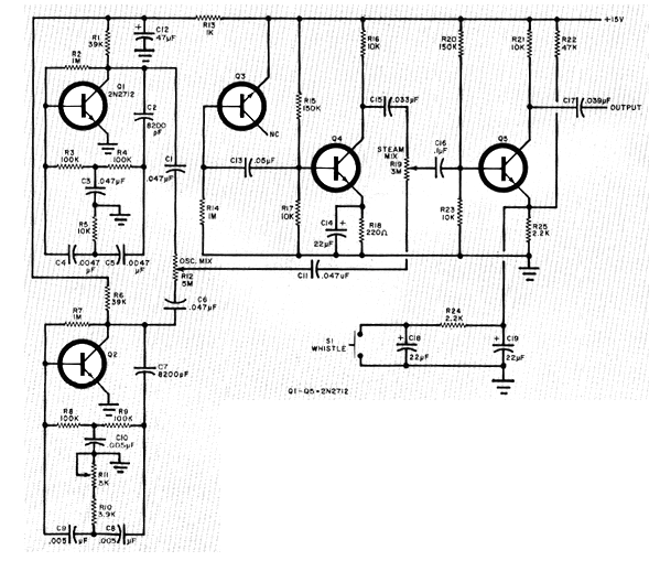 Este circuito salió en el Electronic Experimenter Handbook de 1980, una publicación de la Popular Electronics que ya no existe. El circuito muestra cómo elaborar un simple circuito generador del sonido de silbido de locomotora. La señal se debe aplicar a la entrada de un amplificador de audio. La alimentación debe ser hecha con fuente de 15 V, pero el consumo es bajo, del orden de algunas decenas de miliampères. El ajuste de la velocidad del efecto y por lo tanto de la locomotora se ajusta en R3. Los transistores admiten equivalentes. Para el PNP puede ser el BC558 y para los demás el BC548.