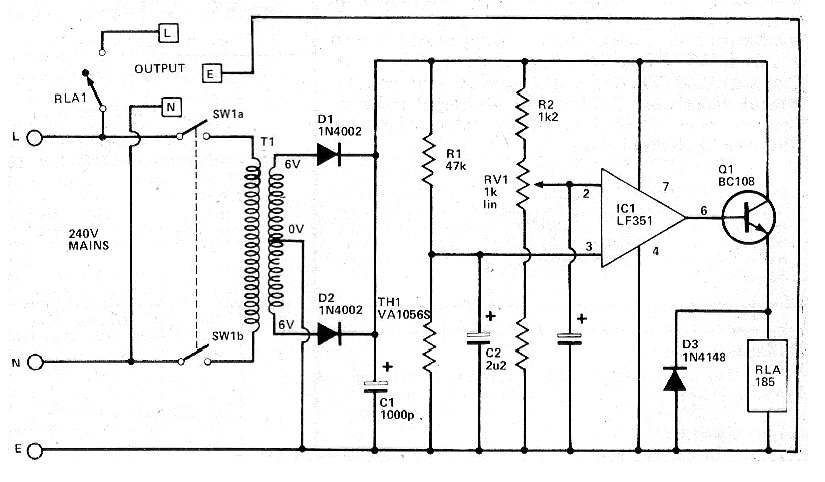 Este circuito salió en una revista Hobby Electronics de marzo de 1980. La revista ya no existe, pero el circuito es actual por los componentes que usa. Este circuito controla un relé accionándolo cuando la temperatura sensorada por el NTC de 47 k supera un determinado valor ajustado en RV1. El transformador es de 6 V x 500 mA el transistor puede ser sustituido por un BC548. El relé es de 6 V x 100 mA, y en el caso, la red es de 240 V, que es la tensión en Inglaterra donde originalmente se publicó la revista. Sólo tienes que utilizar un transformador de 110 V o 220 V de primario para operar en nuestras redes. El IC1 puede ser sustituido por un 741.