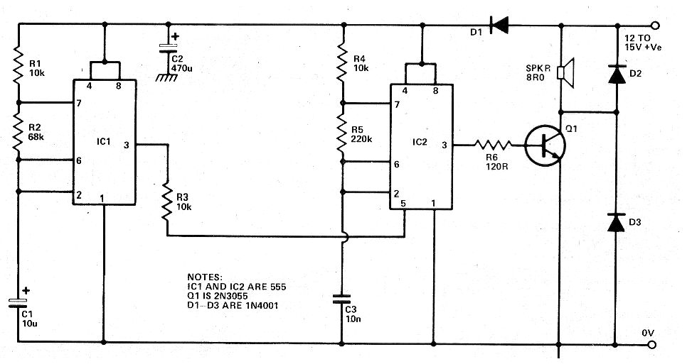 Este circuito salió en una revista Hobby Electronics de marzo de 1980. La revista ya no existe, pero el circuito es actual por los componentes que usa. Este circuito es de una sirena de potencia usando un circuito integrado CMOS. Esta sirena imita la sirena de policía inglesa. Los diodos también pueden ser los 1N4002 o incluso 1N4004. Los demás componentes son comunes. La alimentación se puede hacer con tensiones de 12 a 15 V y el transistor Q1 debe estar dotado de un buen radiador de calor. Los capacitores C1 y C3 se pueden cambiar para cambiar el efecto sonoro.