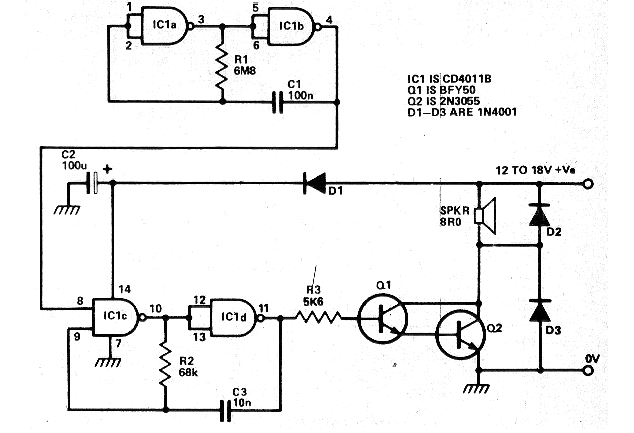 Este circuito salió en una revista Hobby Electronics de marzo de 1980. La revista ya no existe, pero el circuito es actual por los componentes que usa. Este circuito es de una sirena de alta potencia usando un circuito integrado CMOS. El transistor Q1 puede ser sustituido por el BC548. Los diodos también pueden ser los 1N4002 o incluso 1N4004. Los demás componentes son comunes. La alimentación se puede hacer con tensiones de 12 a 18 V y el transistor Q2 debe estar dotado de un buen radiador de calor. Los capacitores C1 y C3 se pueden cambiar para cambiar el efecto sonoro.