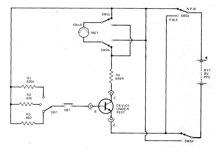 Este circuito salió en una revista Hobby Electronics de marzo de 1980. La revista ya no existe, pero el circuito es actual por los componentes que usa. El circuito prueba la ganancia de los transistores tanto NPN como PNP en tres escalas en que resistencias de base de valores diferentes se utilizan. La alimentación se realiza con una batería de 9 V y el indicador puede ser un instrumento analógico de 10 mA como se utiliza en la escala de corriente correspondiente de un multímetro. Con base en la ganancia de transistores conocidos se puede hacer una escala para el instrumento.