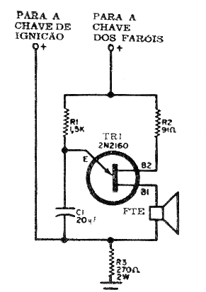 Este artículo salió en una Popular Electronics de julio de 1965. El artículo es actual excepto por el transistor y el transformador. Lo que este circuito hace es emitir una señal sonora si la llave de encendido se apaga y las luces están encendidas. Si bien este recurso ya existe en la mayoría de los coches modernos, en la época era algo para ser montado e instalado. Si bien los transistores unijuntura ya no son comunes, si el lector tiene un 2N2646 que sirve en este circuito, y desea montarlo se trata de algo simple. El altavoz es del tipo pequeño de 8 ohms.