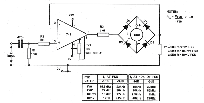 Este circuito salió en un Electronics Today International de mayo de 1993. La revista ya no existe en su versión impresa, pero por los componentes usados el circuito es bastante actual. Este circuito tiene una impedancia de entrada independiente de la sensibilidad del instrumento indicador. Vfsd es la tensión de fondo de escala y Ifsd es la corriente de fondo de escala en el instrumento. Av es la ganancia del circuito que depende de la relación entre R1 y R2. La fuente de alimentación debe ser simétrica de 5 a 9 V. Se pueden utilizar amplificadores operacionales equivalentes. Los diodos pueden ser del tipo 1N4148