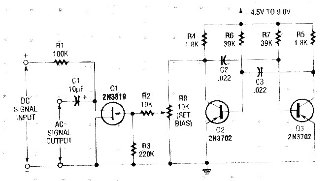 Este interesante circuito con JFET fue obtenido en una revista Electronics Now de abril de 1993. La revista ya no existe, pero el circuito es actual, ya que funciona con prácticamente cualquier FET de unión como el MPF102, BF245, etc. El circuito tiene un consumo muy bajo. Los demás transistores pueden ser los BC548. Lo que este circuito hace es transformar una señal DC de entrada en una señal AC de la misma intensidad. El circuito puede ser usado con sensor, transformando así su señal a una forma que facilite su transmisión a un circuito remoto.