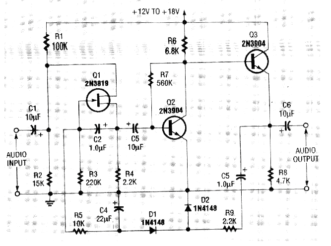 Este interesante circuito con JFET fue obtenido en una revista Electronics Now de abril de 1993. La revista ya no existe, pero el circuito es actual, ya que funciona con prácticamente cualquier FET de unión como el MPF102, BF245, etc. El circuito tiene un consumo muy bajo. Los demás transistores pueden ser los BC548. Lo que este circuito hace es aumentar la ganancia cuando la señal de audio de la entrada disminuye, de modo que su salida se mantiene con volumen constante. Se trata de un circuito muy interesante para ser utilizado con micrófonos donde la distancia del micrófono hasta la persona varía y con ello el sonido se vuelve más bajo o más alto. El circuito corrige este problema. La alimentación puede ser hecha por fuente de baja corriente.