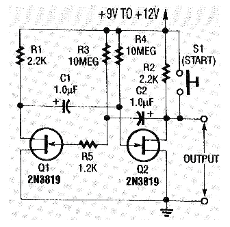 Este simple oscilador astable con JFET fue obtenido en una revista Electronics Now de abril de 1993. La revista ya no existe, pero el circuito es actual, ya que funciona prácticamente con cualquier FET de unión como el MPF102, BF245, etc. El circuito tiene un consumo muy bajo. Además del bajo consumo, el circuito tiene la capacidad también de oscilar en frecuencias extremadamente bajas dependiendo de C1 y C2. Vea en la sección de matemáticas para electrónica cómo calcular la frecuencia de este circuito. Un punto interesante en este circuito es la necesidad de un "impulso" externo dado en S1 para que él inicie las oscilaciones.