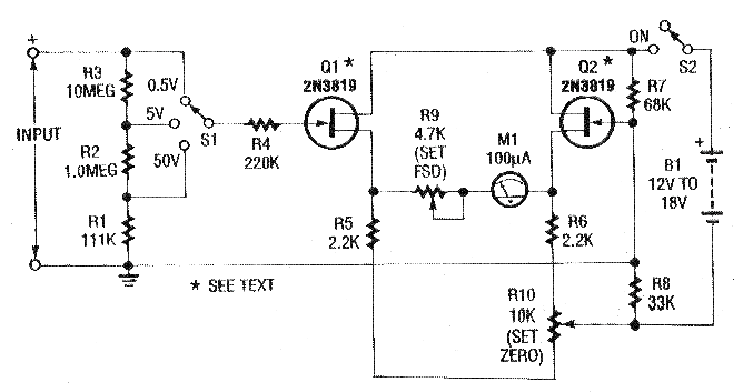 Este simple circuito con JFET fue obtenido en una revista Electronics Now de abril de 1993. La revista ya no existe, pero el circuito es actual, ya que funciona con prácticamente cualquier FET de unión como el MPF102, BF245, etc. El circuito tiene un consumo muy bajo. El circuito tiene tres escalas con una resistencia de entrada de 10 M ohms. El instrumento indicador es un microamperímetro de 100 uA de fondo de escala y R6 hace el ajuste de fondo de escala. El ajuste de nulo se realiza en R9. Los transistores usados, preferiblemente deben ser casados, es decir, con las mismas características.