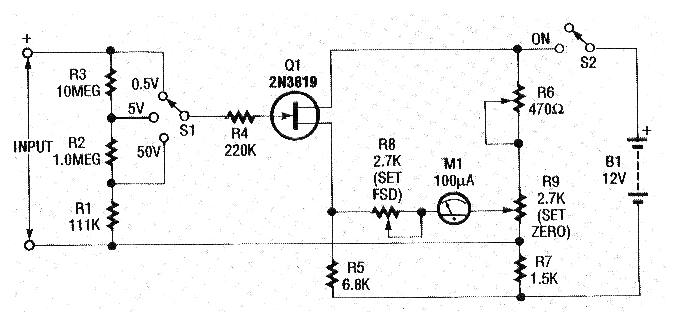 Este simple circuito con JFET fue obtenido en una revista Electronics Now de abril de 1993. La revista ya no existe, pero el circuito es actual, ya que funciona con prácticamente cualquier FET de unión como el MPF102, BF245, etc. El circuito tiene un consumo muy bajo. El circuito tiene tres escalas con una resistencia de entrada de 10 M ohms. El instrumento indicador es un microamperímetro de 100 uA de fondo de escala y R6 hace el ajuste de fondo de escala. El ajuste de nulo se realiza en R9