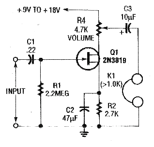 Este simple amplificador con JFET fue obtenido en una revista Electronics Now de abril de 1993. La revista ya no existe, pero el circuito es actual, ya que funciona con prácticamente cualquier FET de unión como el MPF102, BF245, etc. El circuito tiene un consumo muy bajo pudiendo ser alimentado por tensiones de 9 a 18 V. El auricular usado debe ser de 1 k ohms o más.
