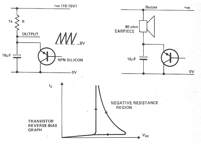 Este circuito salió en la revista inglesa Electronics Today International, en la edición de diciembre de 1975. La revista en su forma impresa ya no existe, pero se trata de un circuito interesante que merece destaque. Algunos transistores poseen una resistencia negativa cuando se polarizan en el sentido inverso, pudiendo esta característica ser usada en un oscilador de relajación, como muestra la figura. Se deben realizar experimentos para obtener el transistor que oscile.