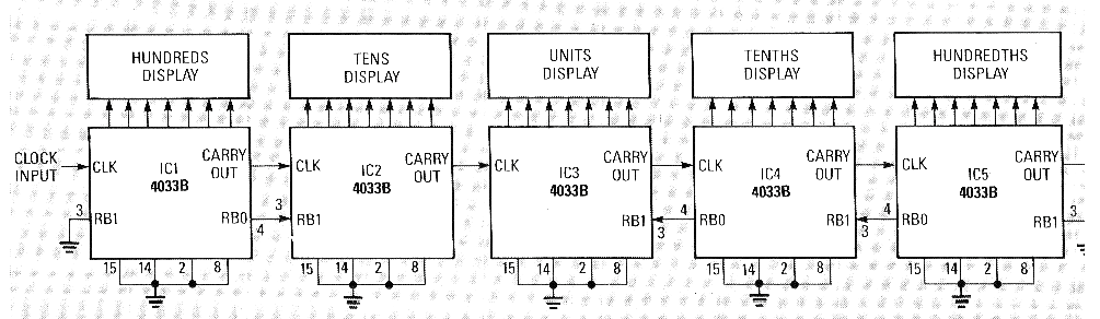 La revista estadounidense Radio Electronics, que ya no existe, en su edición de abril de 1989, muestra cómo cascatear (conectar en serie) cualquier cantidad de contadores 4033 para elaborar un contador con indicación en display de 7 segmentos. En este circuito tenemos la división de la frecuencia de entrada por 10, 1000 y 1000, etc. El circuito puede ser alimentado por tensiones de 5 a 15 V. La frecuencia máxima de entrada es del orden de 10 MHz con 15 V. Con tensiones menores, la frecuencia máxima también es menor. Vea en el Curso de Electrónica Digital más detalles sobre las pinzas de este circuito, con la identificación de la alimentación y otras características para proyecto.