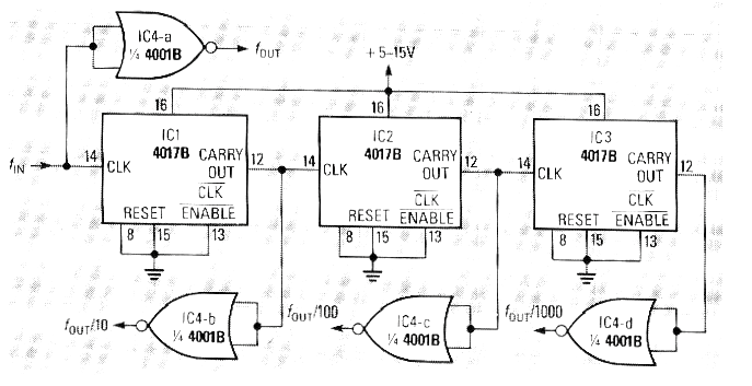 La revista estadounidense Radio Electronics, que ya no existe, en su edición de abril de 1989, muestra cómo cascatear (conectar en serie) cualquier cantidad de contadores 4017. En este circuito tenemos la división de la frecuencia de entrada por 10, 1000 y 1000. El circuito puede ser alimentado por tensiones de 5 a 15 V y los 4001 son interesantes para aislar la salida del contador del circuito alimentado. La frecuencia máxima de entrada es del orden de 10 MHz con 15 V. Con tensiones menores, la frecuencia máxima también es menor. El ciclo activo no es 50%.