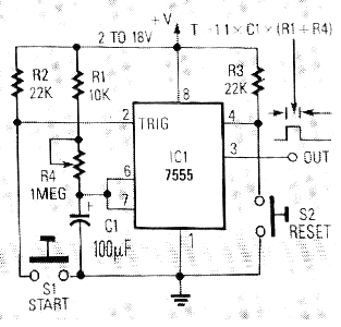 En la figura siguiente tenemos un circuito monoestable que encontramos en la revista Radio Electronics de abril de 1988. Se trata de una configuración bastante interesante que ya usamos en diversos de nuestros proyectos e incluso citamos en nuestros libros. El circuito puede ser alimentado con tensiones de 5 a 15 V y la entrada consiste en la transición poitiva de la señal. Una salida permanecerá en el nivel bajo por un tiempo dado por R1 / R4 y C1 según la constante de tiempo de este circuito. Vea en la sección de matemáticas para electrónica cómo calcular los componentes de este circuito. El 7555 es la versión CMOS del conocido 555.
