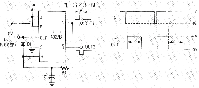 En la figura siguiente tenemos un circuito de shield monoestable que encontramos en la revista Radio Electronics de abril de 1988. Se trata de una configuración bastante interesante que ya usamos en diversos de nuestros proyectos e incluso citamos en nuestros libros. El circuito puede ser alimentado con tensiones de 5 a 15 V y la entrada consiste en la transición negativa de la señal. Una salida permanecerá en el nivel bajo por un tiempo dado por R1 y C1 según la constante de tiempo de este circuito. La otra salida permanecerá en el nivel bajo por el mismo período. La señal de redispara reinicia la temporización. La alimentación positiva es en el pin 14 y la tierra en el pin 7 para este circuito.