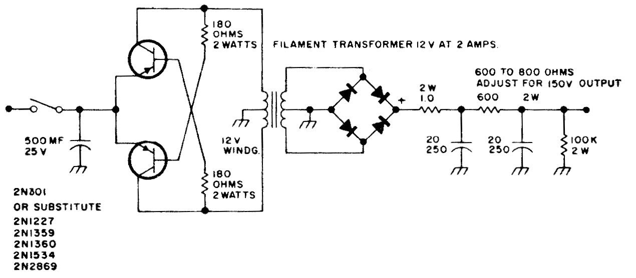 Este circuito proporciona una alta tensión para la alimentación de circuitos de válvulas o de batería de 12 V. El transformador determina el rendimiento y los transistores admiten equivalentes más modernos, ya que el circuito original es de 1975.